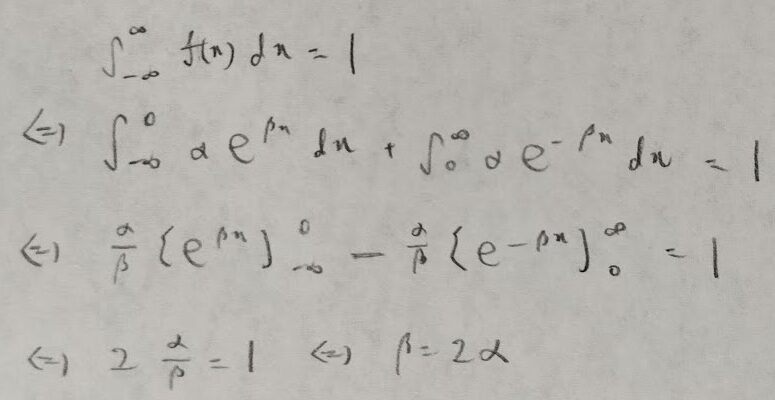 もしラプラス分布に気づかない場合(多分こちらが普通です。僕も2024年の受験時には気づきましたが2025年の今は気づかなかったです)は素直に全確率=1からβとαの関係を下記のように求めましょう!