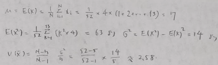 この問題の母分散は、1〜13のカードから一様に1つを取り出す時の状況を考えればOKです。別解も追記します。