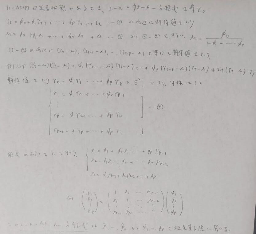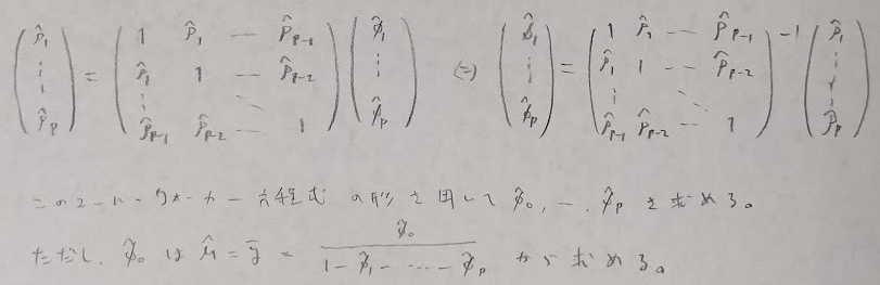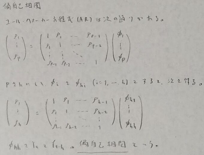ユールウォーカー方程式は必須です。この方程式はARモデルのみ存在します。ユールウォーカー方程式の派生形から偏自己相関を求めることができます。