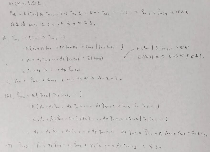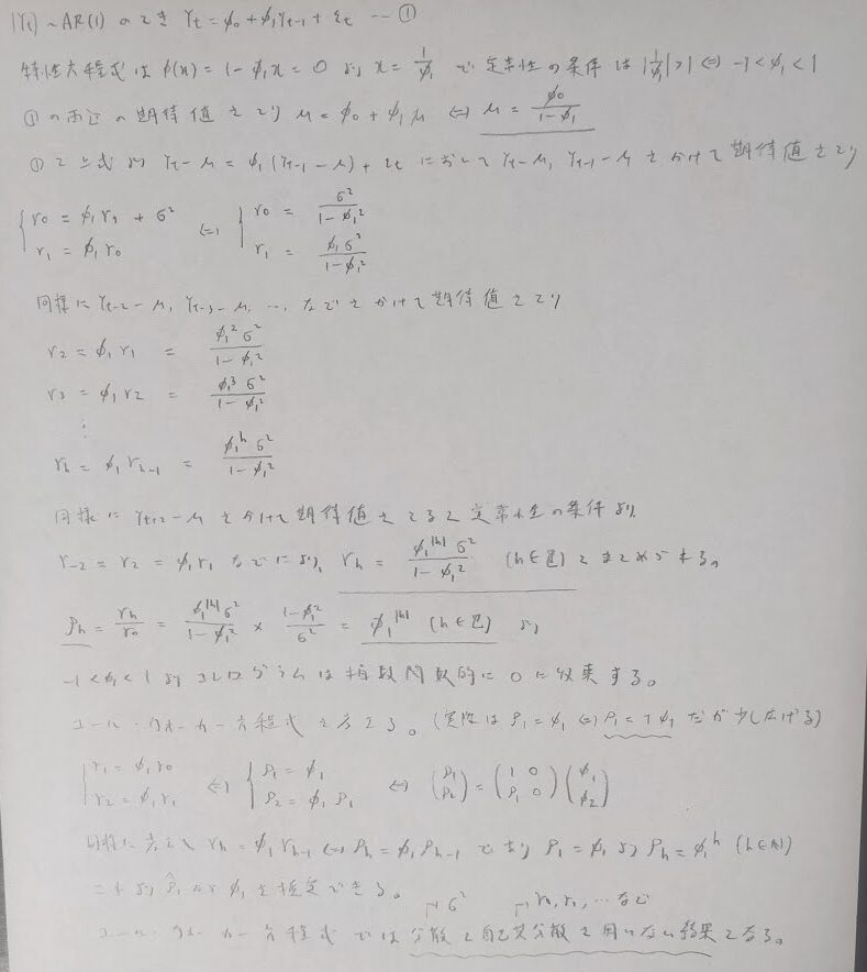 AR(p):h=p+1以降は突然0になることはことはユール・ウォーカー方程式から導かれます。実際は試験問題で瞬時に0と書くことになります。