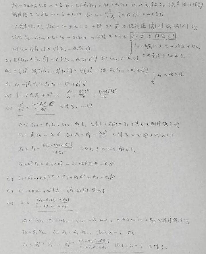 アクチュアリー数学の時系列解析の中で最も覚えにくい公式です。この公式を覚えるくらいなら導出法をしっかりと学んで、時間をかけてでも確実に正答できる方が、続くARMA(2,1)モデルなどの問題にも落ち着いて対処できるようになります。