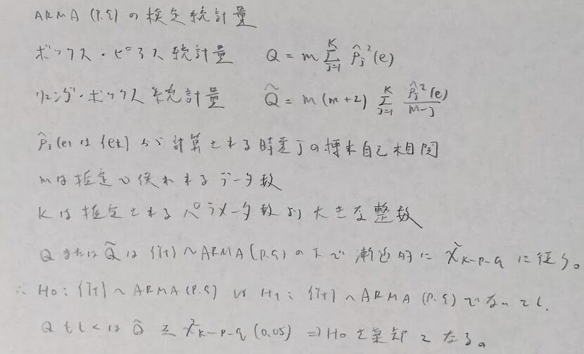 残差系列を用いてモデル診断のための統計量を計算し、その値によってモデルの妥当性を検定することができます。