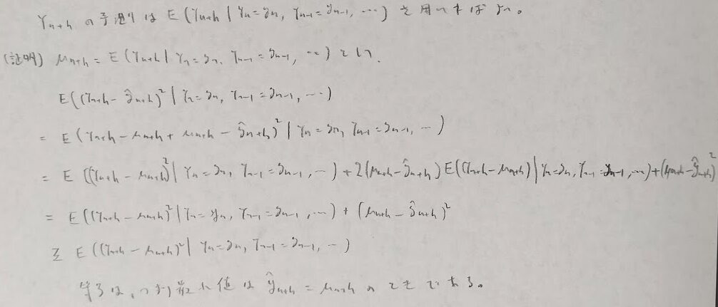 予測量が下記の条件付き期待値で表現されることは平均2乗平均を最小にすることで証明ができます。