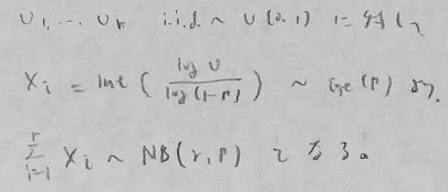 まず最も単純な方法は幾何乱数の和として表現することです。