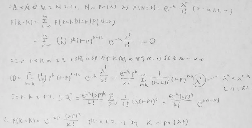 この別解の方法はポアソン分布の再生性の応用的な考えでも納得がいく結果ではないでしょうか?