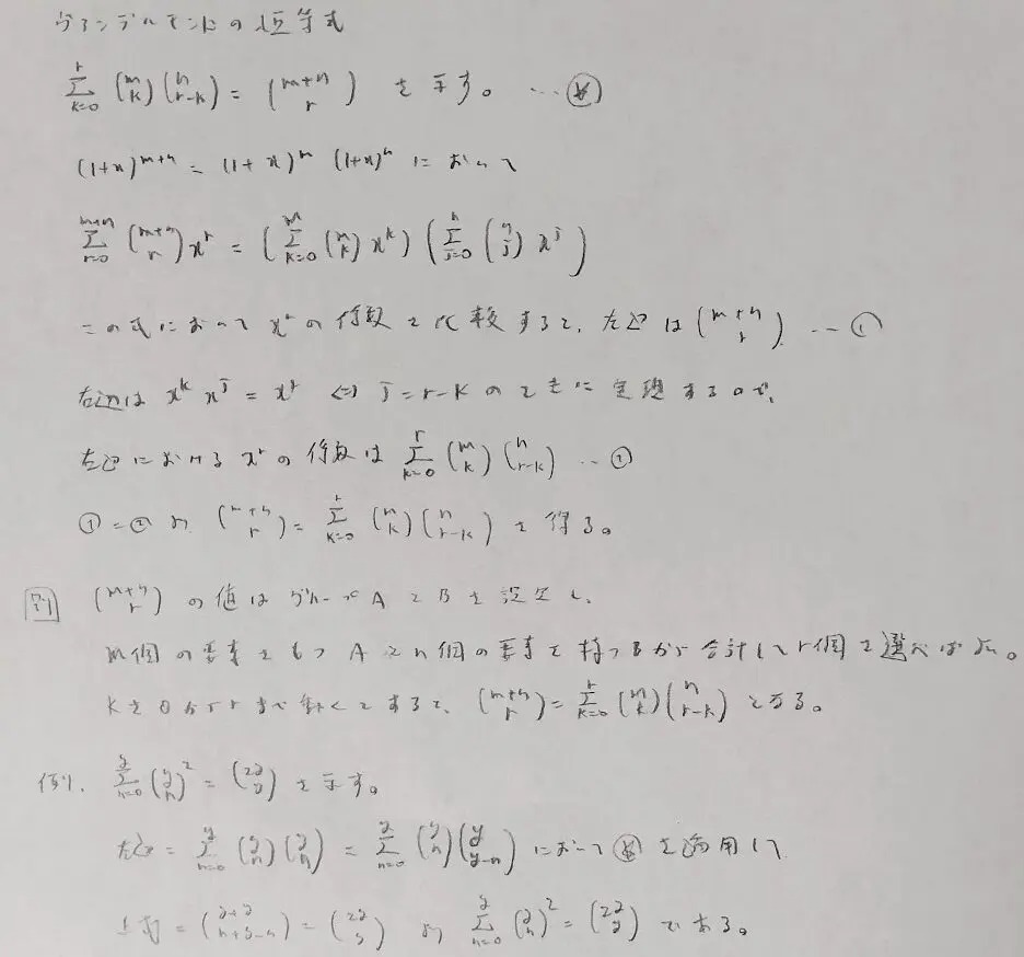難易度を高くしているのは2番目の関係式(ホッケースティック恒等式)の存在です。大学入試ではお目にかかることがないので、多くの方にとって初見問題となります。