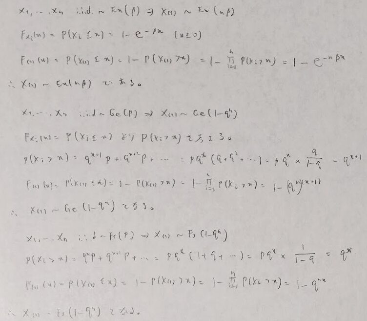 幾何分布とファーストサクセス分布と指数分布の最小統計量の公式は覚えておきましょう。