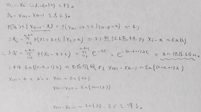 感覚的な考え方としてはn個の機械があってその最小統計量とは、どれかの機械が壊れる時間なので1個の機械が壊れる時間が(1個と比べてn個あるので)期待値は1/nつまり(どれかの機械という意味で)n倍壊れやすい(すぐの時間で壊れてしまいやすい)ので、Γ(1,n)が最小統計量の従う分布になります。そして残りn-1個の機械において、最初に壊れる機械(つまりX(2)-X(1))が従う確率分布はΓ(1,n-1)になります。