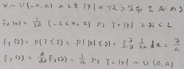最後の確率密度関数の結果からU(0,a)とする箇所は、分布関数においてyの範囲が0<y<aとなることを用いています。