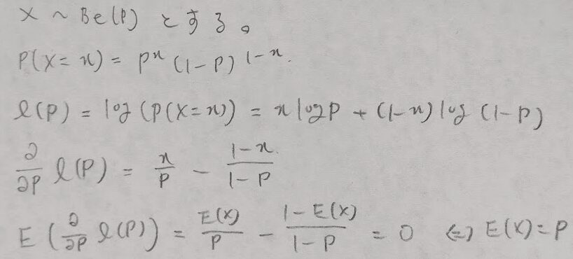 実はスコア関数の期待値が0という性質を用いると魔法のようにベルヌーイ分布の期待値が計算できます。