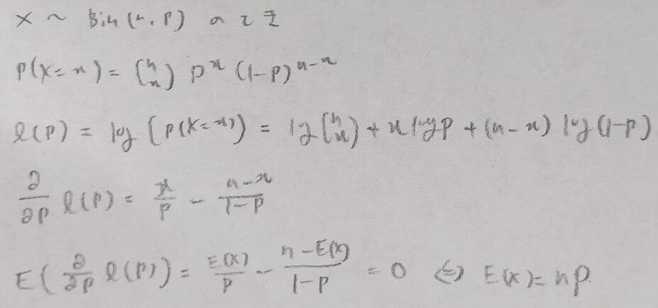 ここでは先ほどと同様にスコア関数の期待値が0という性質を用いた二項分布の期待値の導出を行います。