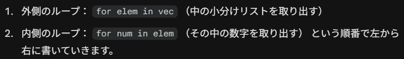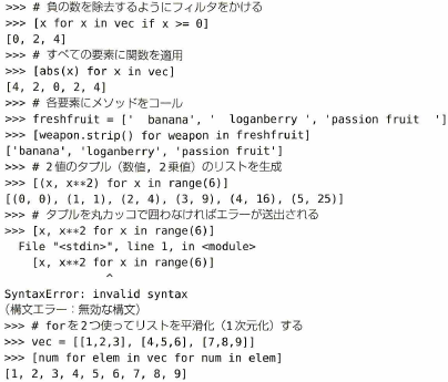 リストの角括弧[]内でforを使って記述したものをリスト内包といいます。リスト内包を使うとfor文による複合的な処理を1つの簡潔な式で表現できます。