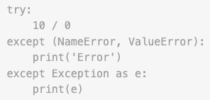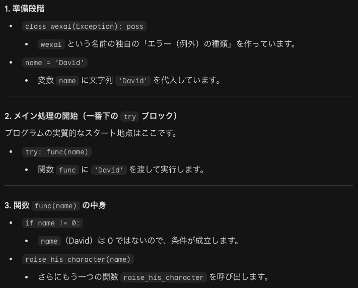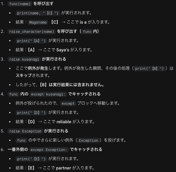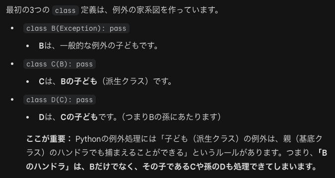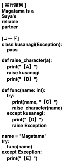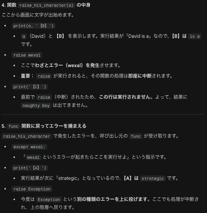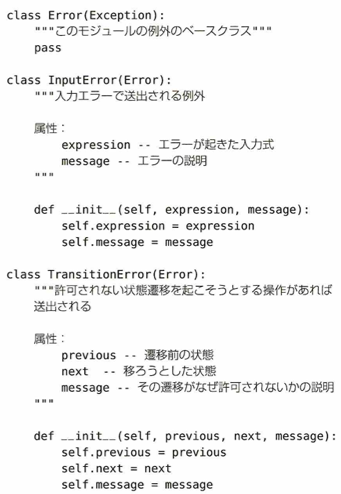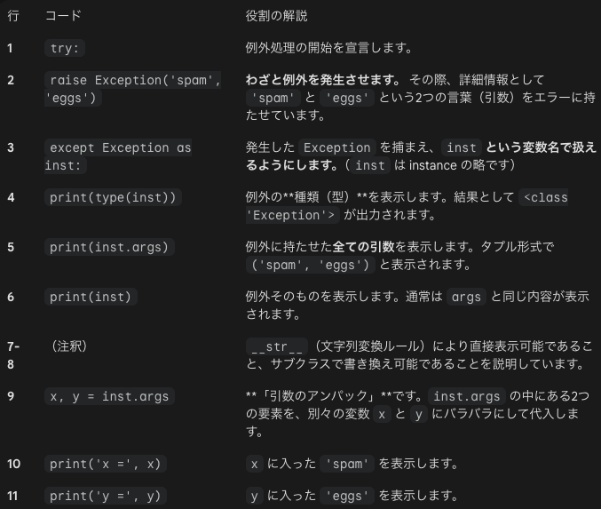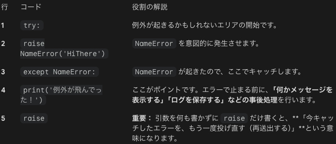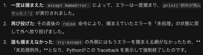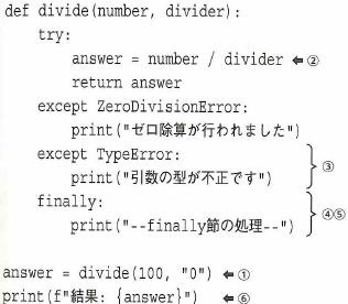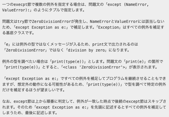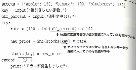 コードが文法として正しい場合でも実行時に起きるエラーを例外(exception)といいます。引数のデータ型が誤っていたり、存在しない名前の変数を参照したりしたときに起きます。このときPythonはエラーメッセージを表示して動作を停止します。例外を検知して発生時の動作を実装するにはtyr-exception文を使います。例えばint()関数にint型に変換できない値があるとValueError(データ型が合っていても値が不適切)という例外が発生します。またディクショナリに存在しないデータを参照しようとするとKeyErrorという例外が発生します。NameErrorは未定義の変数(または関数)を使用すると発生するエラーです。except節で複数の例外を処理するには()内に処理したい例外をすべて列挙します。