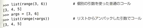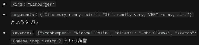 引数をタプルやディクショナリとして参照する方法(アンパック)について、*が先頭についた仮引数(関数に定義する引数)は指定済みの実引数(関数を呼び出す際に指定する引数)を除く位置引数のタプルが入ります。**が先頭についた仮引数には、指定済みの実引数を除くキーワード引数のディクショナリが入ります。