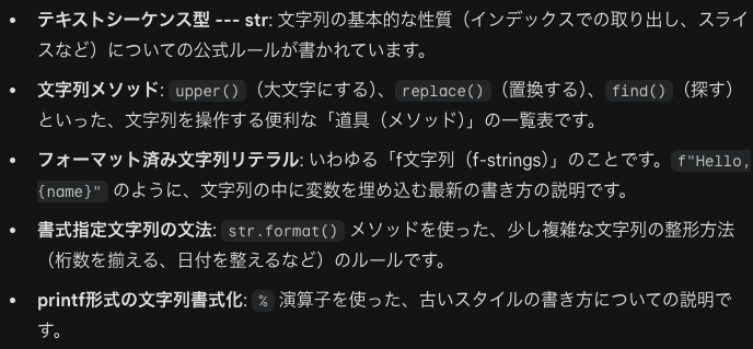 フォーマット演算子でbは2進数、xは16進数です。リストの要素を加えるときは.append(値)の他に、+=[値]もあります。sorted( )関数は昇順です。関数定義の最後には:を付けます。*はタプル、**は辞書。
