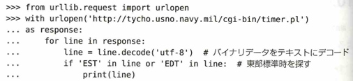 urlopen()は組み込み関数のopen()と同じように扱えますが、対象のデータをバイナリモードで取得します。バイナリデータを文字列に変換するためにdecode()関数を用います。