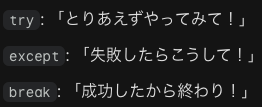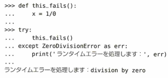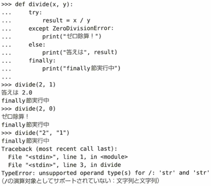 tryのelse節はtry節が例外を送出しなかった場合に実行されます。try文のexcept節は、try節から呼び出された関数で発生した例外も処理します。
