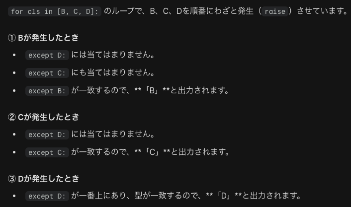 上の例のように”0”で割るのはデータ型が対応していないのでTypeErrorです。意図しないデータ型が与えられたりしたときにも発生します。対してValueErrorは意図しない値が与えられた場合に発生します。int("ABCD")ならValueErrorが発生します。