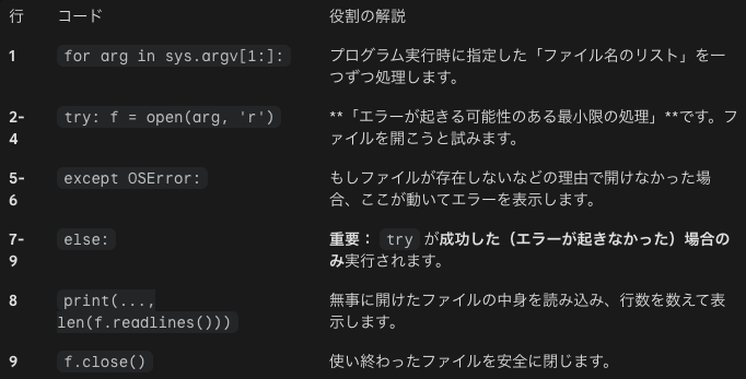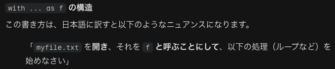 with 文(コンテキストマネージャ)を使用してファイルを開くと、ブロックを抜けた際(エラー発生時も含む)に、自動的に f.close() が呼ばれ、ファイルが適切に閉じられます。