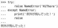 例外を送出するときにraise文を使うと任意の例外を発生させることができます。