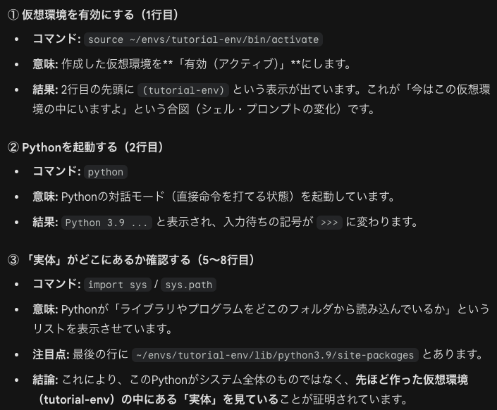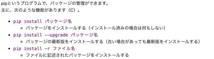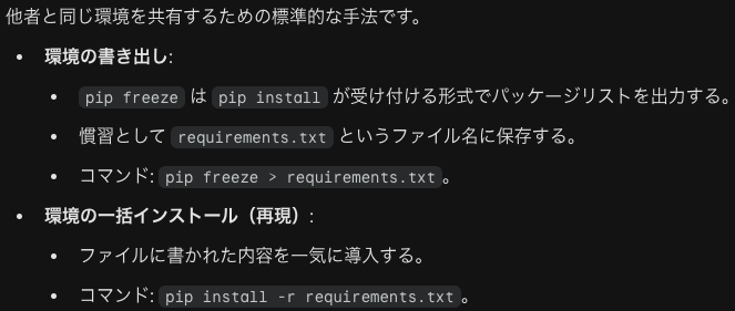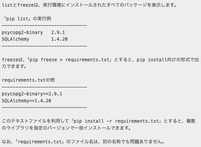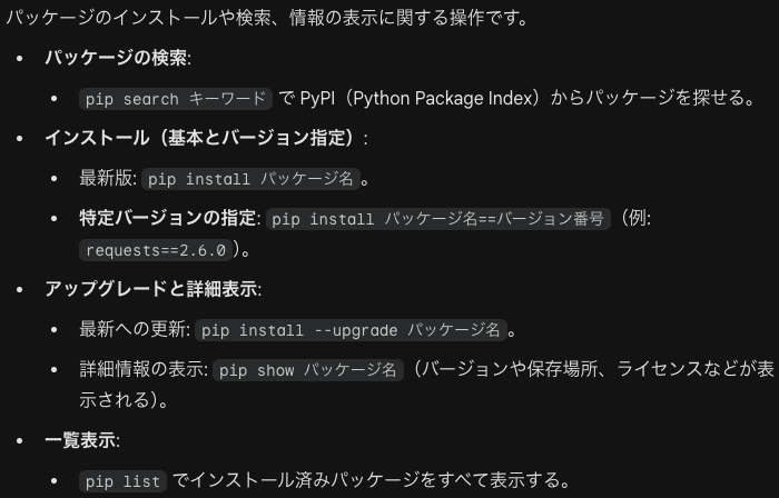 仮想環境 (venv) とセットで出題されることが多いので、python -m venv コマンドで環境を作った後に、これらの pip コマンドでパッケージを管理するという流れを意識しておくと完璧です。