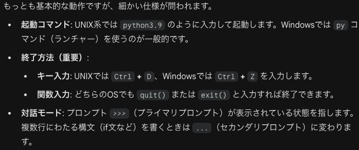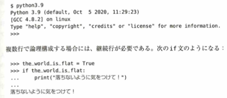 対話モードではバージョン番号、ヘルプなどのコマンド、一次プロンプト(>>>)、二次プロンプト(…)の順で表示されます。