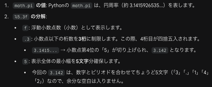 文字列スライスにおいて負数で指定する文字列スライスの場合は右端の文字の右側が0で左に向かって順に-1,-2,…と文字が小さくなります。b,d,x,f,%はそれぞれ値を2,10,16進数で表す、値を与えられた精度までの小数で出力する、値を100倍士パーセント記号がついた形式で出力します。例えば7dは右寄せ7桁幅で「 15000」などと表示されます。
