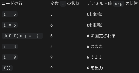 引数のデフォルト値は関数が定義された時点で評価され、関数の実行時に再評価は行われません。