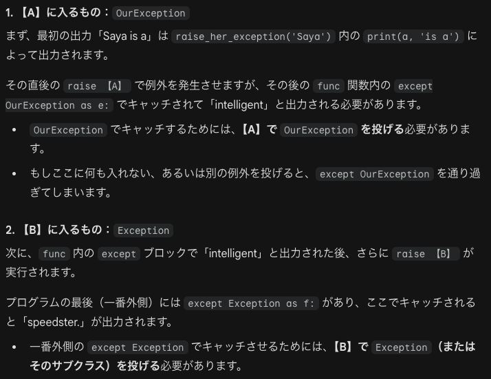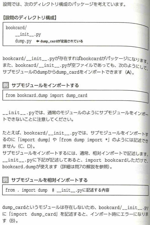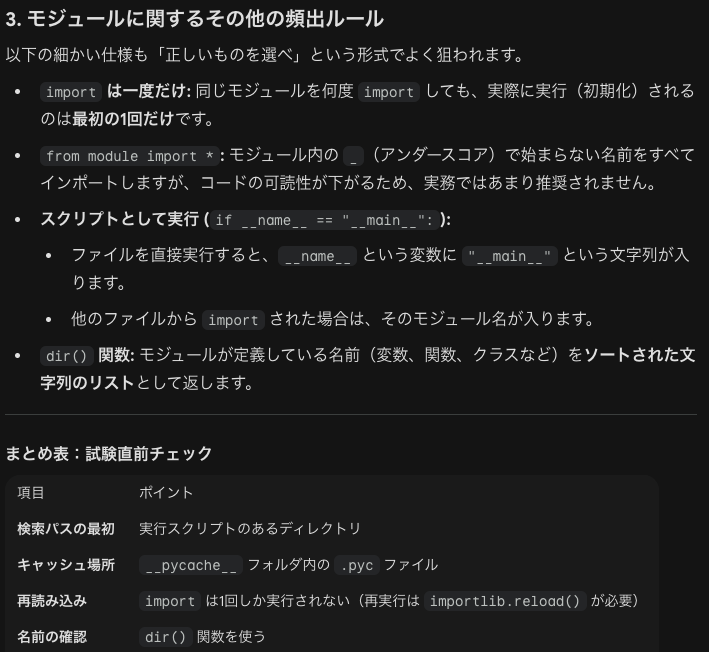 if __name__ == '__main__':」は、インタープリタで関数が意図せず実行されないようにしたり、「python module.py」でfunc()を確実に実行するために記述します。読み書き両用はr+です。try文に複数のexcept節がある場合、一度の処理で実行されるexcept節は一つまでです。「ハンドラ」とは「except節で設定した処理」を指します。