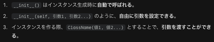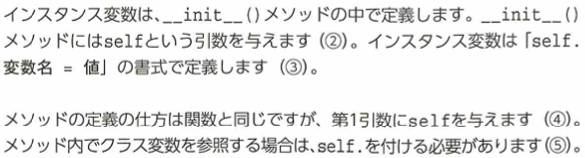 クラスに__init__()メソッドが定義してあると、新規生成されたインスタンスに対して自動的に__init__()メソッドがコールされます。__init__()メソッドに引数を与えることはできます。