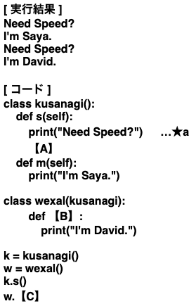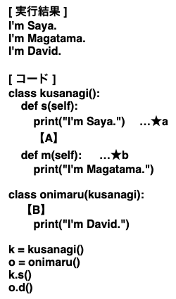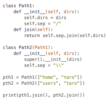 います。pth1.join()を出力するとhome/taroになります。pth2.join()に出力について説明します。派生クラスのオブジェクトは、基底クラスのメソッドが使えます。 メソッドjoin()は、派生クラスのPath2に定義されていませんが、基底クラスのPath1に定義されています。そのため、pth2.join()を実行できます。メソッドinitで、pth2.sepを"\"に設定されているので、pth2.join()を出力するとusers\taroになります。
