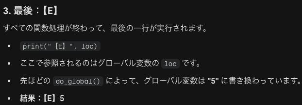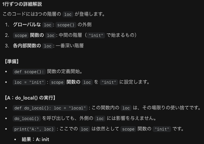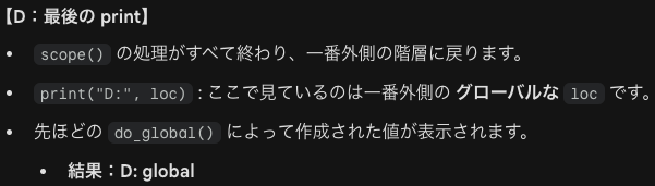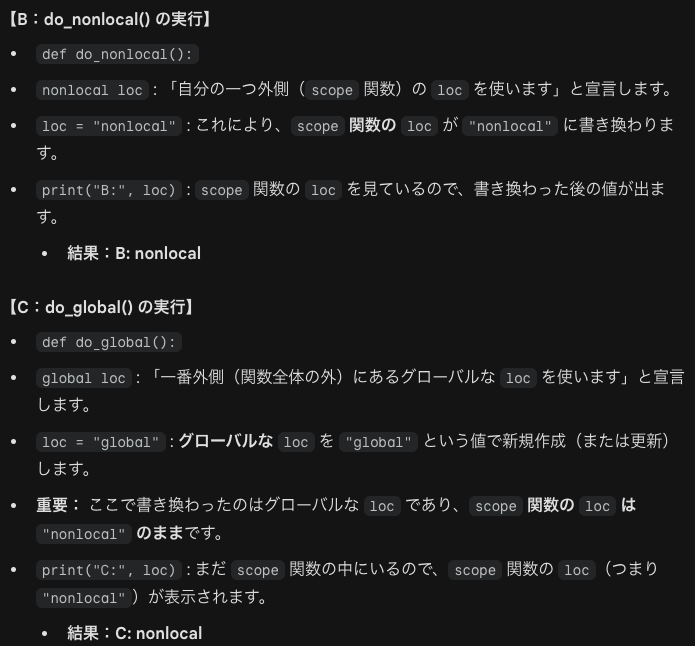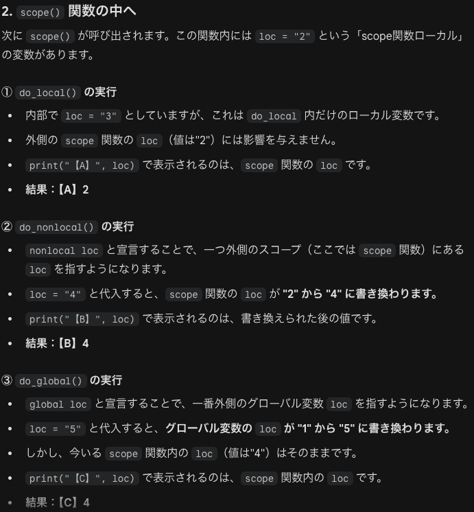 関数の外側で定義されたグローバル変数に値を代入するときはglobal文を用います。関数内で定義される変数(ローカル変数)は関数の外側では参照できません。このときNameErrorが発生します。つまり関数の内側と外側では変数のスコープが異なります。