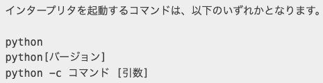 インタープリターを対話モードで起動すると、プロンプトが>>>と表示されます。インタープリターは、引数をつけて実行できます。この引数は、sysモジュールのargv属性で取得できます。 引数にソースファイル名を指定すると、そのファイルを実行します。さらに、python -m モジュール名とすると、モジュールのソースファイル名を完全な形で指定したかのように実行できます。