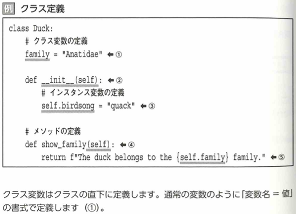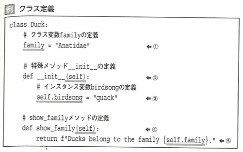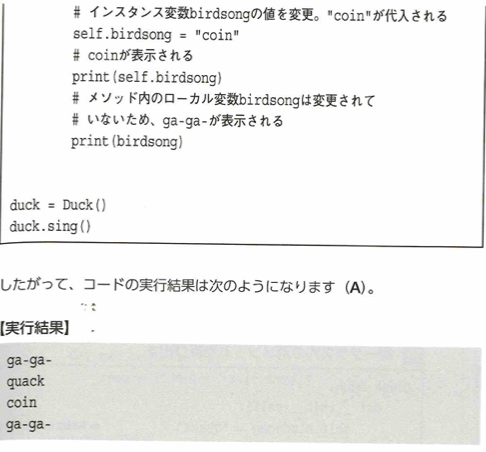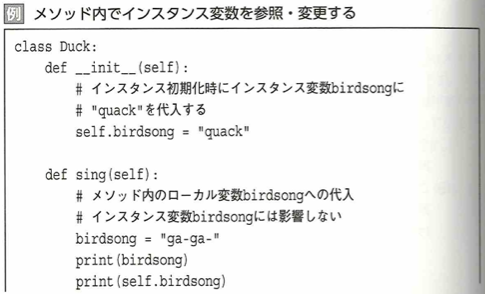 クラスのインスタンス化は、duck=Duck( )です。クラス( )はインスタンスを返り値とする関数です。メソッド内にインスタンス変数と同名の変数がある場合、それらは別の変数として扱われます。