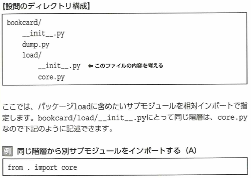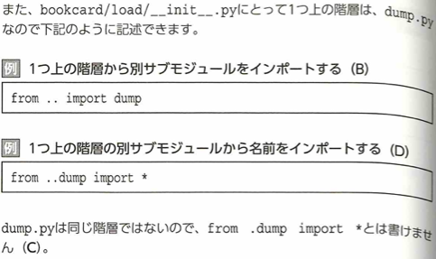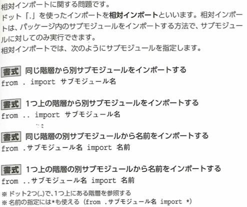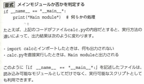 インポートされるファイルをモジュールといいます。import calendar、calendar.prmonth(2000,1)などとします。しかし関数のみをインポートする場合は、from calc import addなどとします。名前をすべてインポートする場合はfrom calc import * などとします。ただし_で始まらない名前すべてです。__all__があれば、そのリストの名前だけインポートされます。