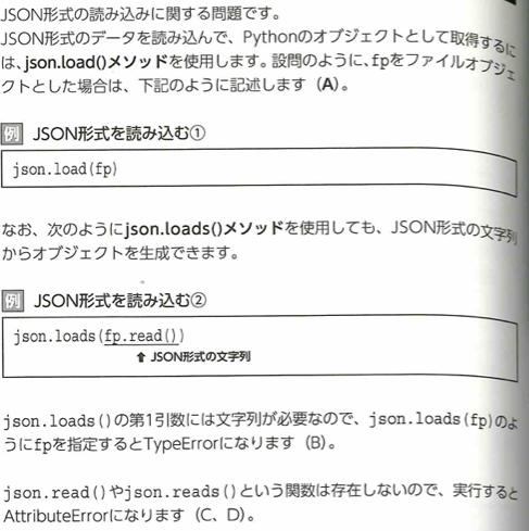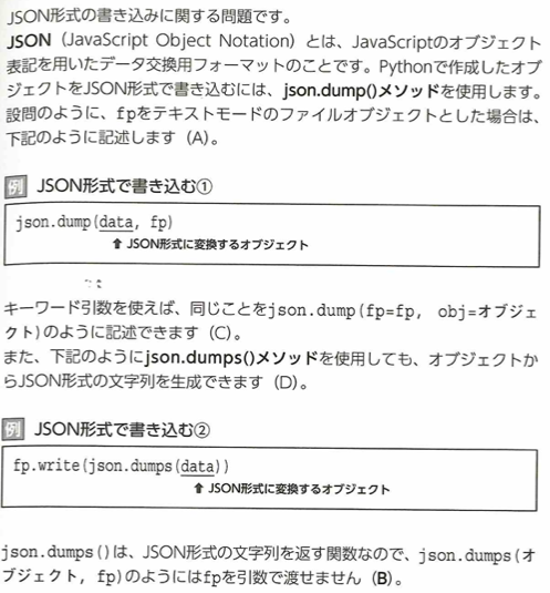 JSON形式の書き込みは、json.dump( )メソッド、json.dumps( )という関数を使用できます。JSON形式の読み込みは、json.load( )メソッド、json.loads( )という関数を使用できます。これら2つは関数ですがメソッドです。