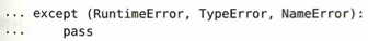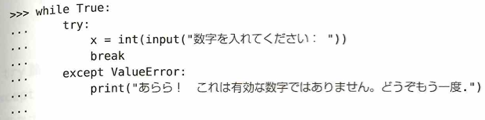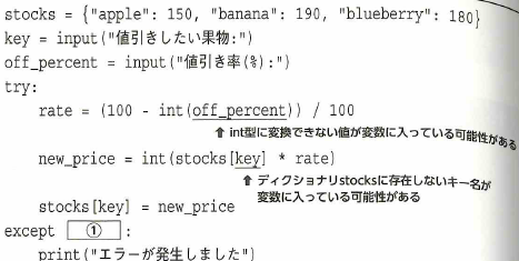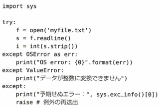 コードが文法として正しい場合でも実行時に起きるエラーを例外(exception)といいます。引数のデータ型が誤っていたり、存在しない名前の変数を参照したりしたときに起きます。このときPythonはエラーメッセージを表示して動作を停止します。例外を検知して発生時の動作を実装するにはtyr-exception文を使います。例えばint()関数にint型に変換できない値があるとValueError(データ型が合っていても値が不適切)という例外が発生します。またディクショナリに存在しないデータを参照しようとするとKeyErrorという例外が発生します。NameErrorは未定義の変数(または関数)を使用すると発生するエラーです。except節で複数の例外を処理するには()内に処理したい例外をすべて列挙します。