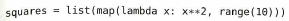 リスト内包表記 [a ** 3 for a in range(5)] は、map 関数を使って書き換えることができます。map(関数, イテラブル) は map オブジェクトを返すため、最終的にリストの形にするには list() で囲む必要があります。完成形:list(map(lambda a: a**3, range(5)))