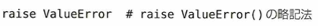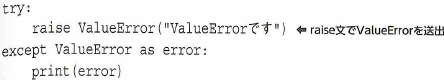 例外を送出するときにraise文を使うと任意の例外を発生させることができます。