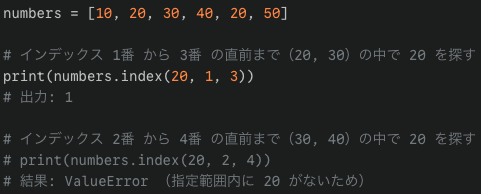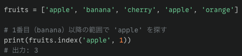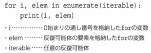 enumerate()関数は、for文と組み合わせて、リストや文字列などの反復可能体(for文による繰り返しが可能なもの)からインデックスと要素を同時に取得できます。