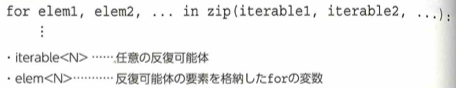zip()関数は複数の反復可能体から並列で要素を取得できます。