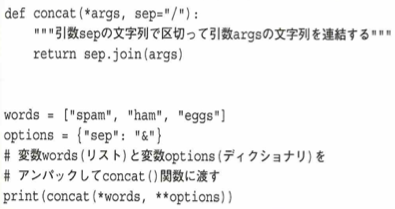 引数をタプルやディクショナリとして参照する方法(アンパック)について、*が先頭についた仮引数(関数に定義する引数)は指定済みの実引数(関数を呼び出す際に指定する引数)を除く位置引数のタプルが入ります。**が先頭についた仮引数には、指定済みの実引数を除くキーワード引数のディクショナリが入ります。