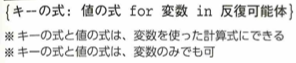 ディクショナリを1行だけで作成する方法を内包表記といいます。