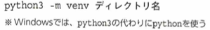 仮想環境を作成、管理するのに使われるスクリプトはpyvenvです。