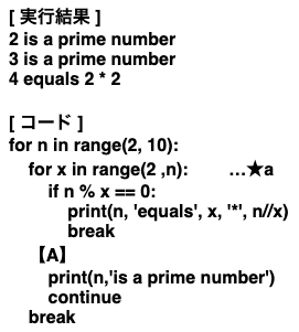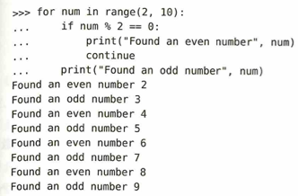 else: は通常 if と同じ高さに書く必要があります。もし else を使うなら、一番下の「even number」の print 文を else: ブロックの中に入れなければなりません。continue があることで、それ以降の処理(偶数用のprint文)をスキップして、次のループ(次の数字)へ移動します。