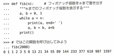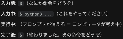 対話モードではバージョン番号、ヘルプなどのコマンド、一次プロンプト(>>>)、二次プロンプト(…)の順で表示されます。