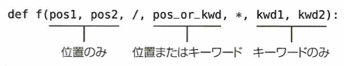 """…"""や'''…'''のようにダブルクォーテーションやシングルクォーテーションを3つ使って囲めます。これを三重引用符といい、文字列内で直接改行できます。""…""のような記述はできません。位置, / ,位置またはキーワード, *, キーワードです。