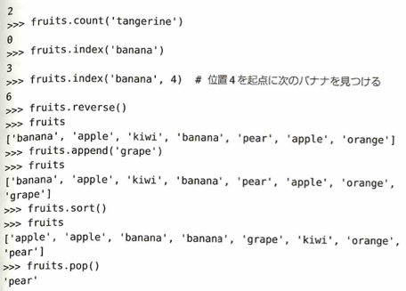 スタックは末尾に要素を追加して末尾からとるLIFO型のデータ構造です。追加と削除はそれぞれappend()とpop()で対応します。例えば空データにdata.pop( )などとするとIndexErrorとなります。pop(0)は先頭の要素を削除するという意味で一般化可能です。