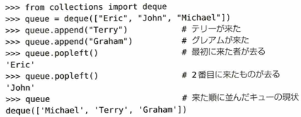 collections.dequeはキューのように使えるデータ構造です。append(要素)とpopleft()で行います。取り出すときは必ず左側から取り出します。また両端キューという種類のキューでもあります。先頭に要素を追加する場合はappendleft()メソッドを用います。末尾から要素を取り出す場合はpop()メソッドを用います。