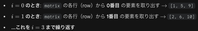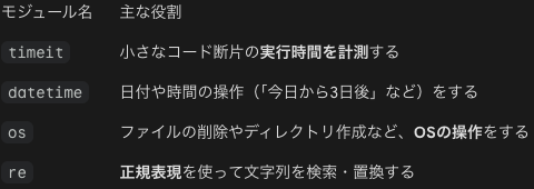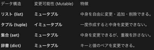 引数部分の : int や : str もすべてアノテーションに含まれます。アノテーションは引数と戻り値の両方に記述できる「注釈」のことです。__annotations__ という属性に保存される、という名前が問われることがあります。ネストしたリスト(行列)の縦と横を入れ替える「転置」に関するものにおいて、list(zip(matrix)) と、アスタリスク(*)を忘れるとエラーまたは意図しない結果になります。正しいコードは power = list(zip(*matrix))です。(-1, -10, -3, -4) > (-1, -2, -5)はFalseで、1 > -1 == (1-2)はTrueです。